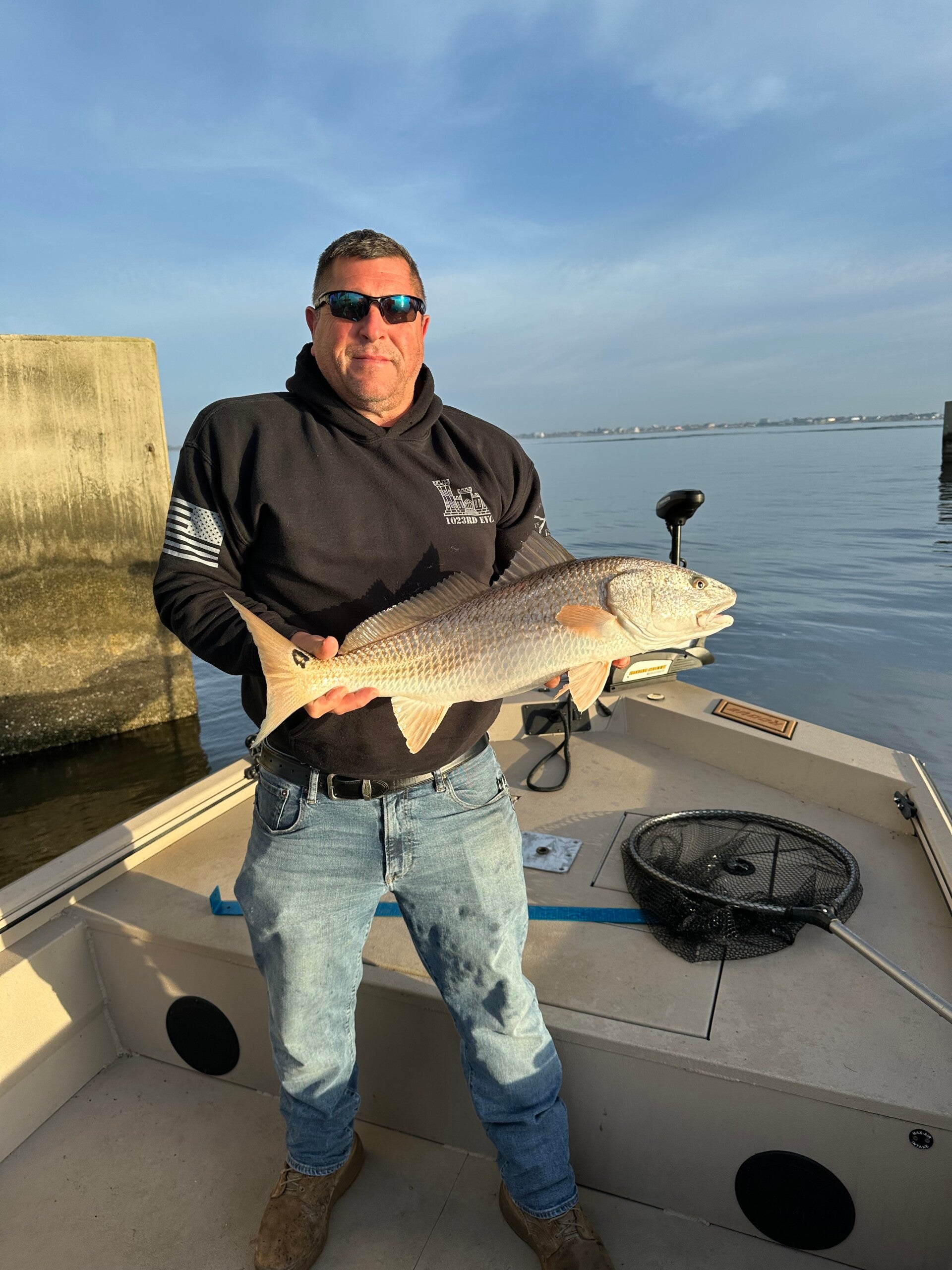 The boat I currently run is the 2024 Avid 20 Rogue center console aluminum boat. It is outfitted with a 2024 Yamaha 115 SHO outboard that pushes this boat around 42-46 mph depending on the load. With two live wells, keeping live bait is no issue. Clients will be able to enjoy plenty of space and the music of their choice with the installed stereo, and getting lost is never a thought with the 7 inch garmin gps in the dashboard. With a hydraulic jack plate for the motor, this boat has no problem getting into those shallow spots bigger boats may have trouble with!